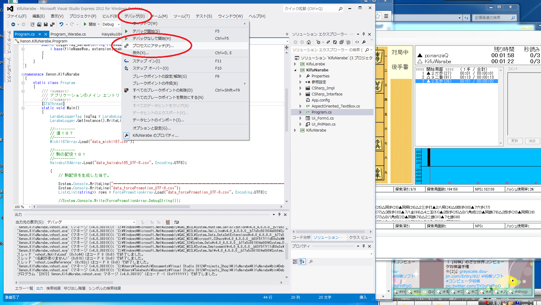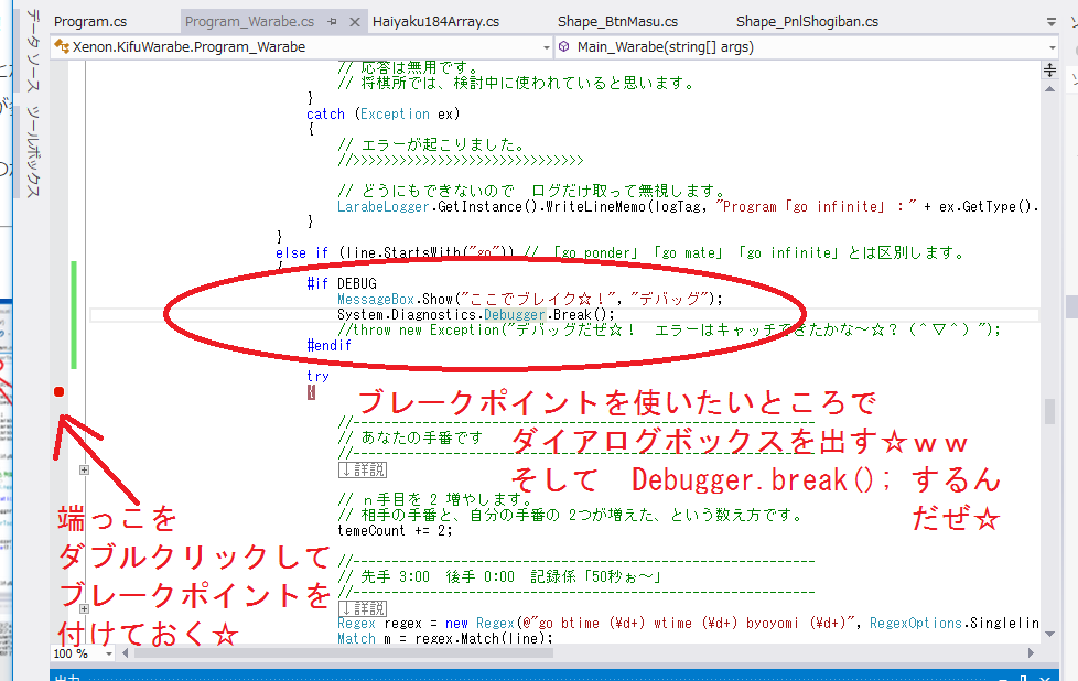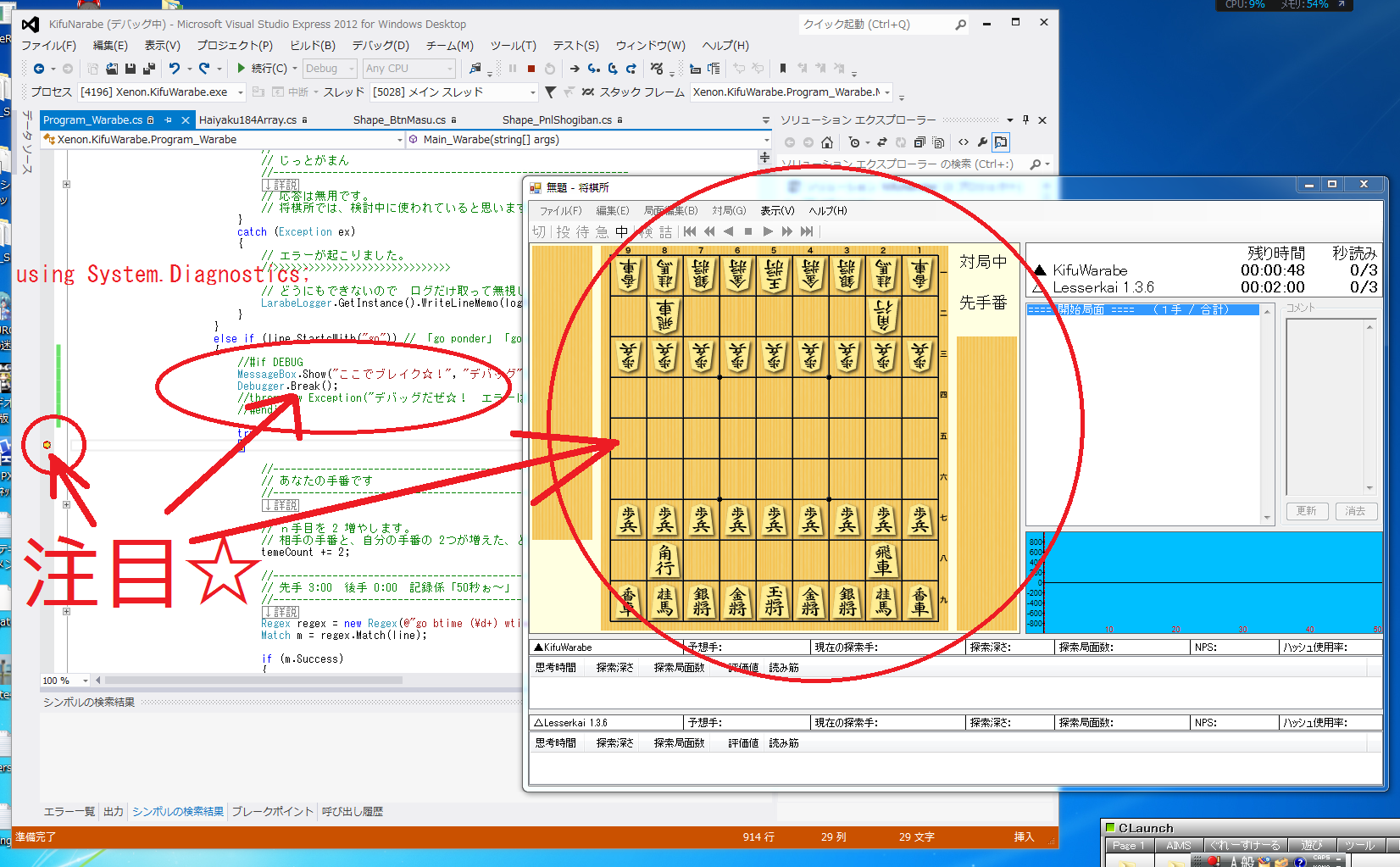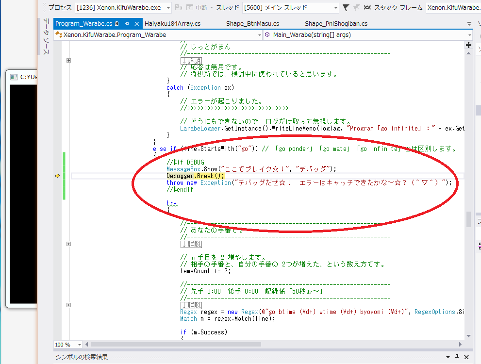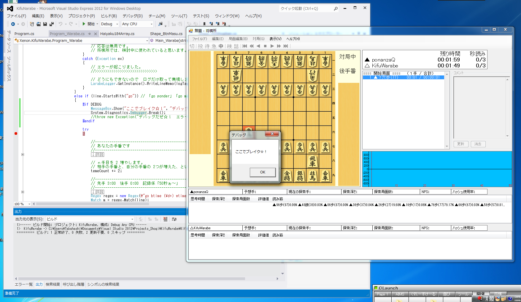 (1) 将棋エンジン『きふわらべ』にブレークポイントを置き、