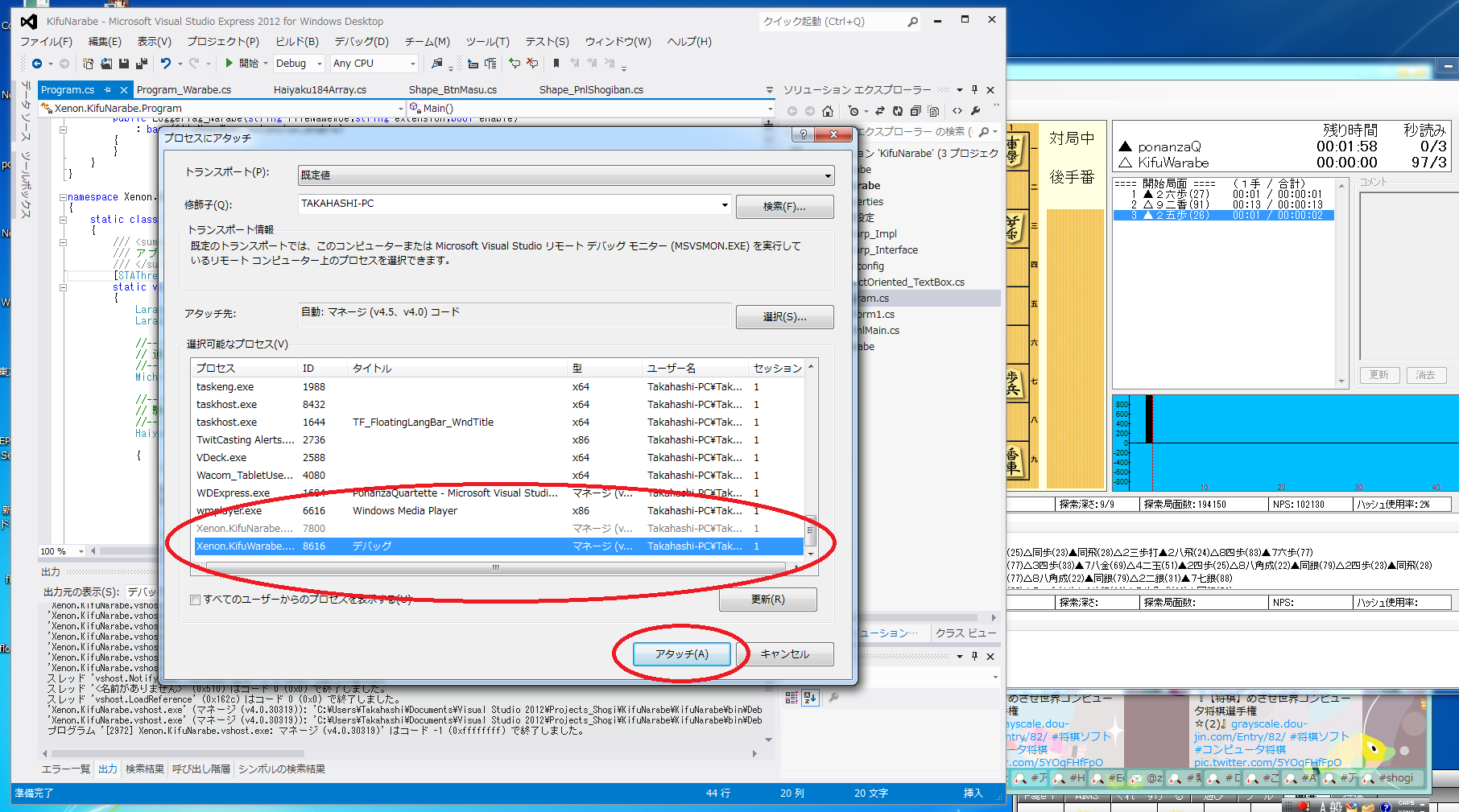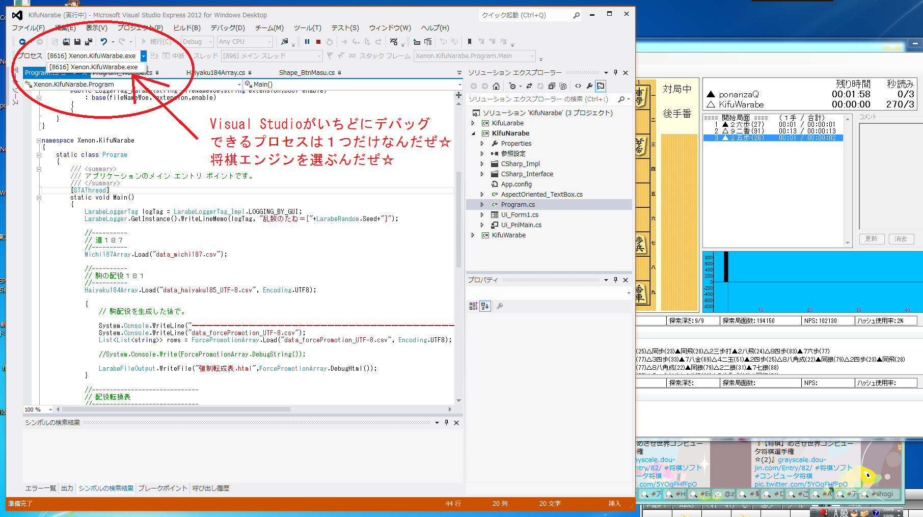 「Visual Studio C# からは、別プロセスで動いている将棋エンジンを