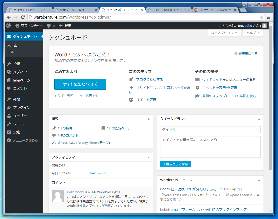 ワードプレスのインストールが完了していたみたいなんだぜ☆」