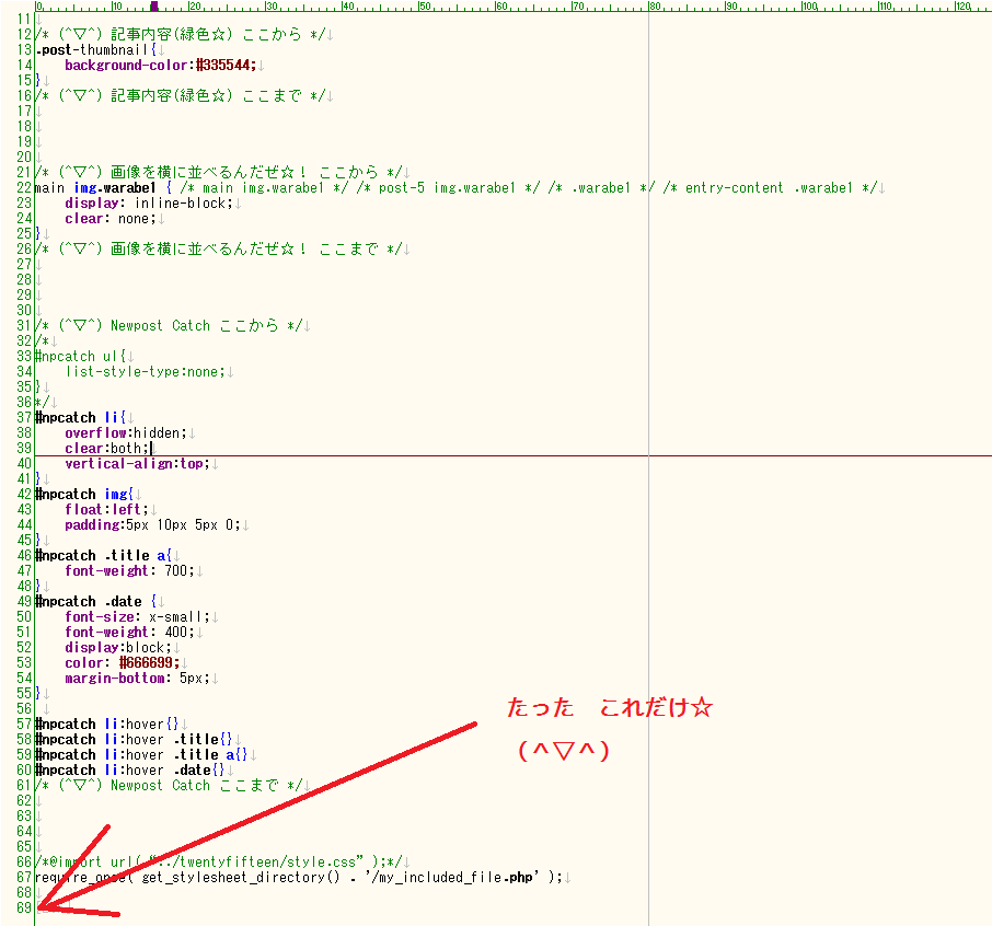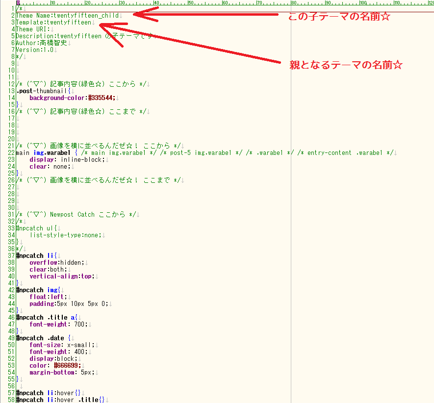 子テーマの style.css には 70行ぐらい書かれているぜ☆