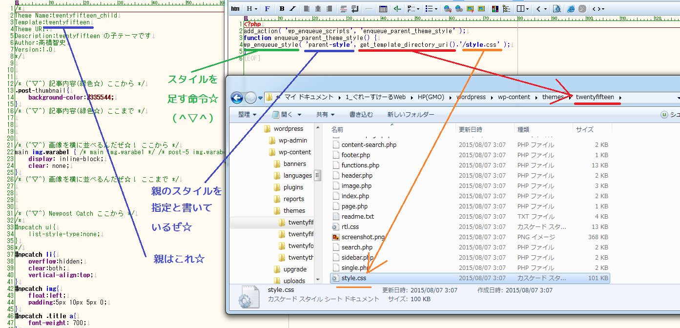 「親テーマの style.css と、子テーマの style.css を見比べてみよう☆」