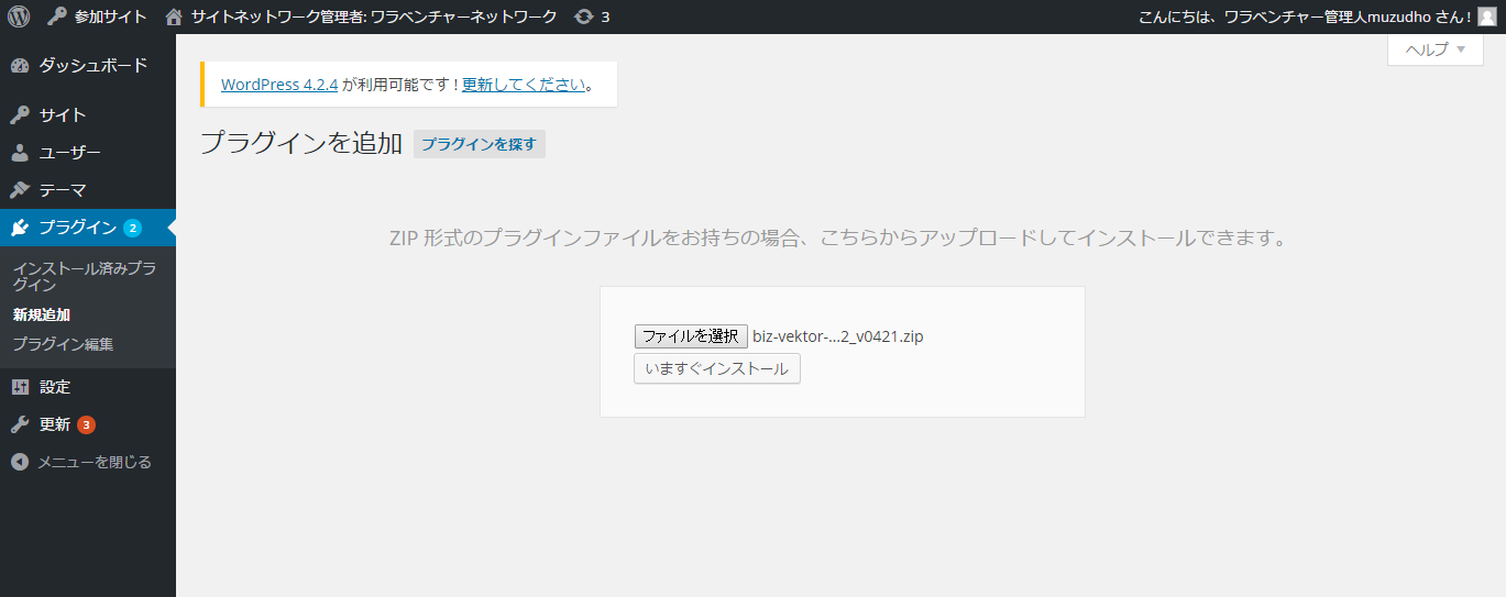 「アップロードして、zip解凍して、wp-content/plugin/ フォルダーの下に