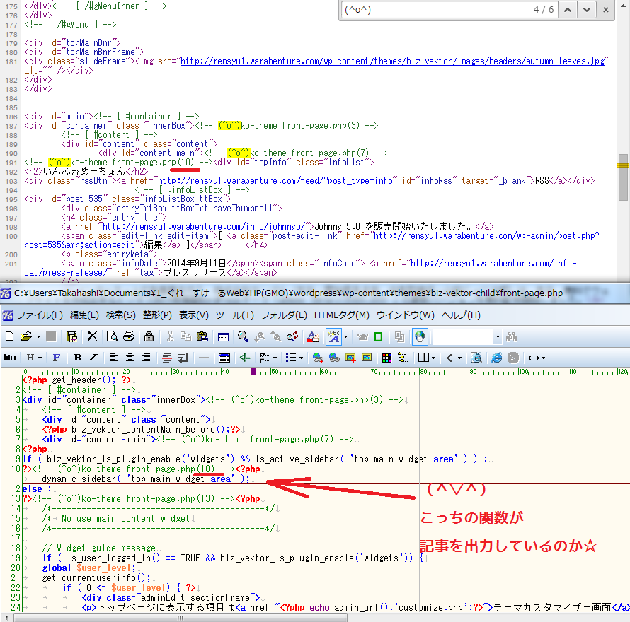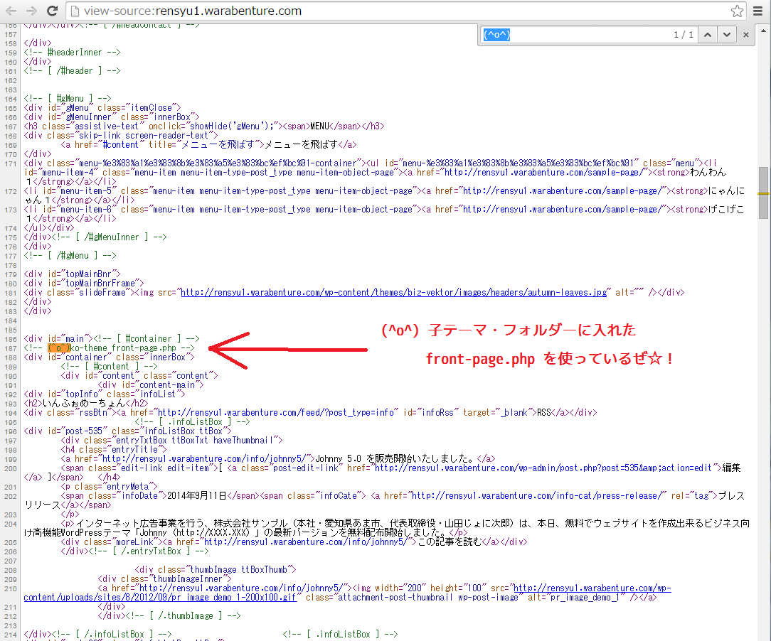 「よしよし、子テーマのフォルダーに入れた front-page.php を