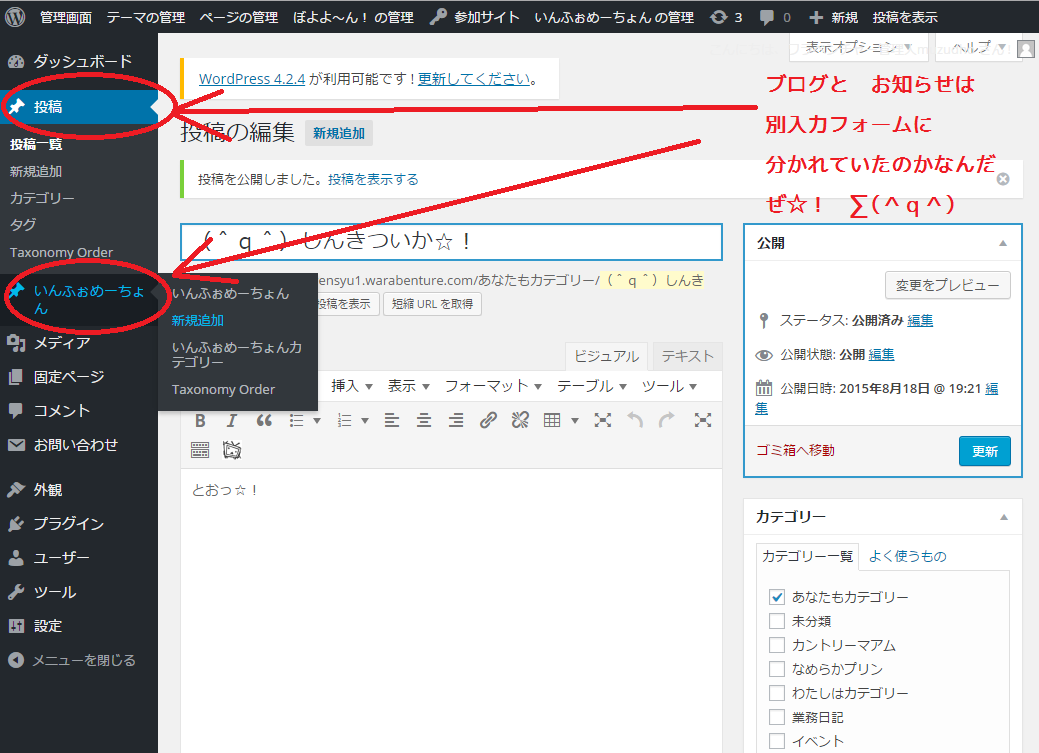 「あっ☆ 記事投稿と、 お知らせ投稿は 別のフォームに